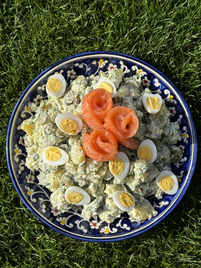 Сегодня мы готовим тёплый картофельный салат с йогуртовой заправкой и лососем.