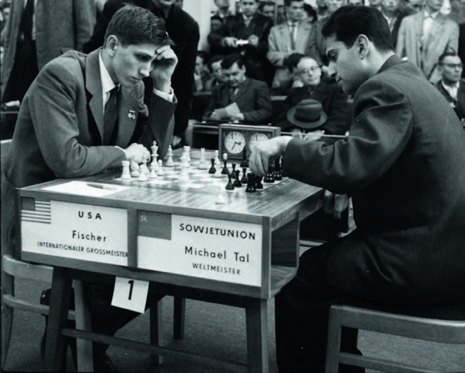 За доской два чемпиона мира, две легенды — Бобби Фишер и Михаил Таль. Олимпиада в Лейпциге, 1960 г. Фото: Creative Commons/Bundesarchiv